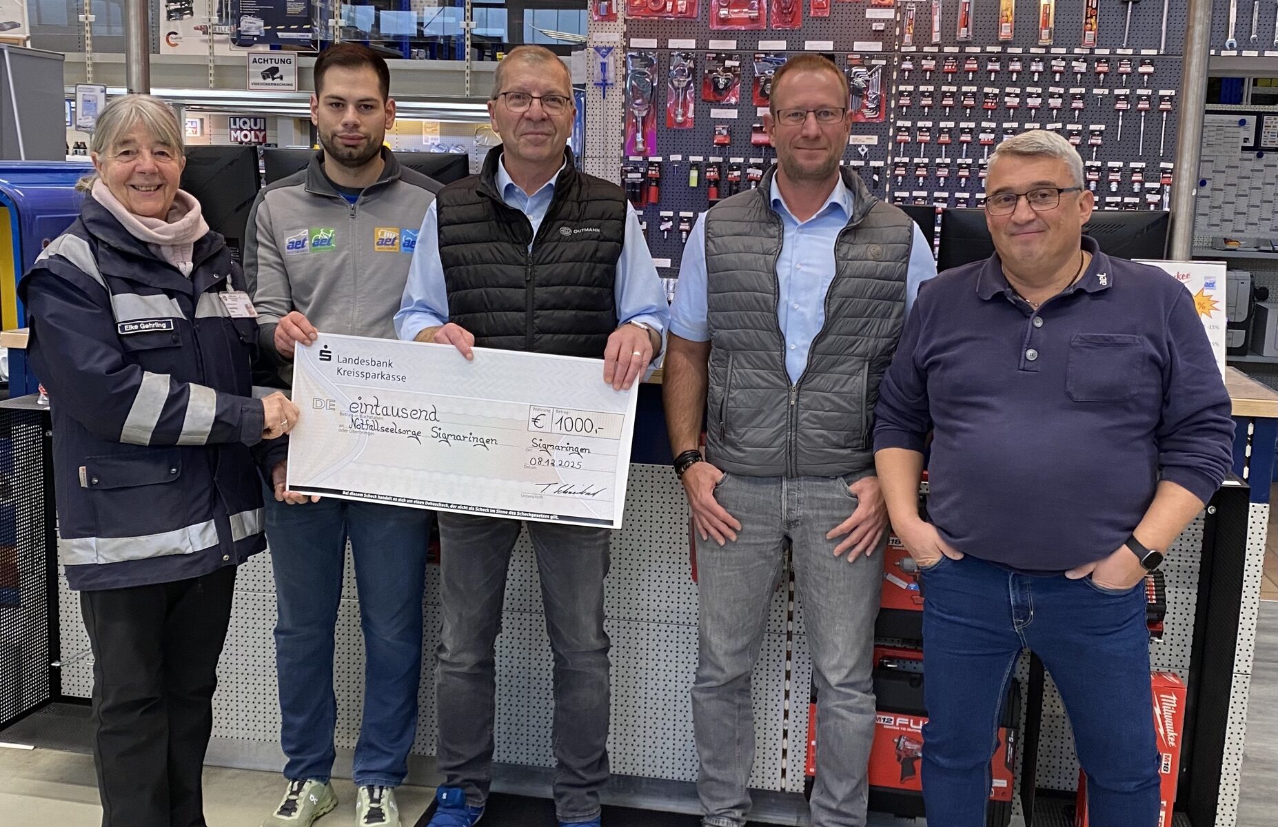 Bei der Scheckübergabe in Sigmaringen überreichte die Firma AET eine Spende in Höhe von 1.000 € an die PSNV Sigmaringen. Vielen Dank für diese so wertvolle Unterstützung.